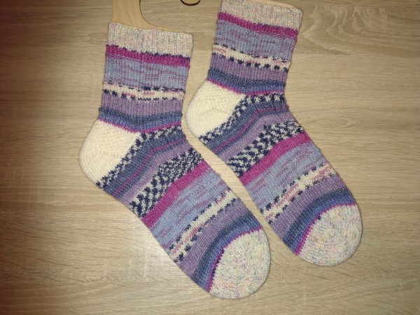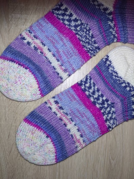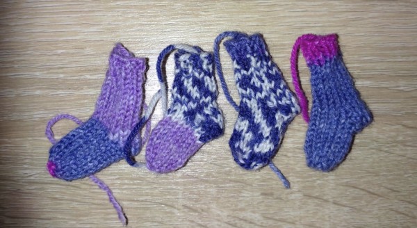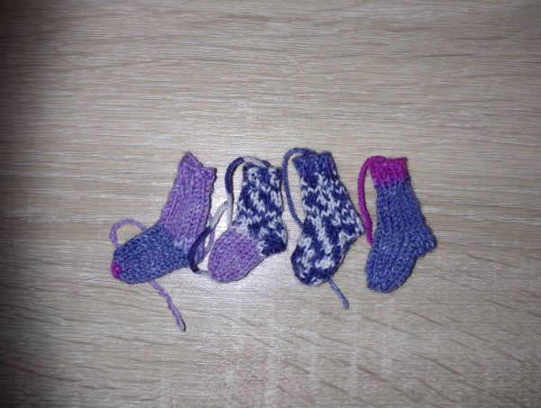 柄合わせで余った糸でミニ靴下を編みました。プレゼント用なので、ミニ靴下は加工し易いように糸始末せずそのまま渡すつもりです。