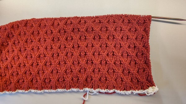 この模様は交差が多くて、記号だけ見たら普段ならスルーしている所なのですが、試しに編んでみたら陰影がいい感じに出ているような気がして選びました。