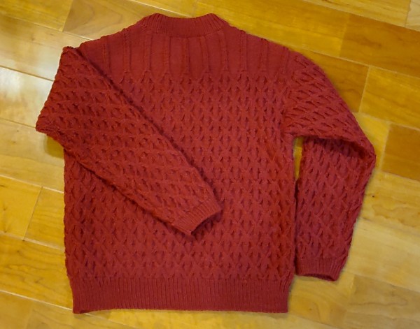 | 赤いセーターが欲しくなって、編みました。「自分サイズのセーターを編む」の表紙の白いセーターを参考にしています。 衿のゴム編みは長くして二重にしました。 |