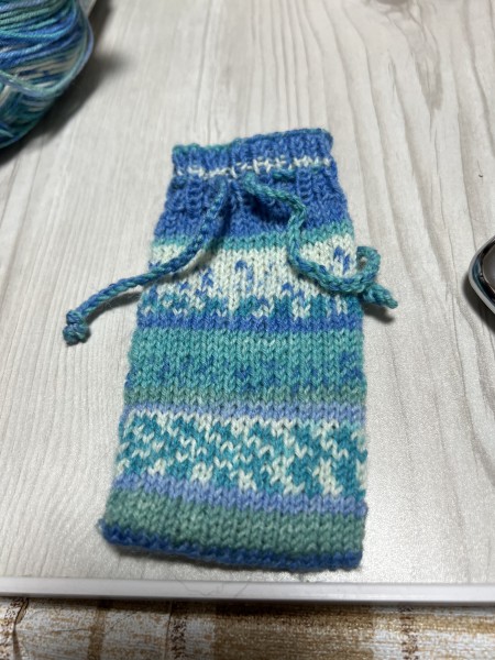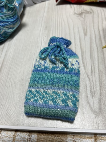 別糸で30センチの紐を二本作り、ゴム編みの中間(5段目)にとじ針で通して巾着にしあげます。