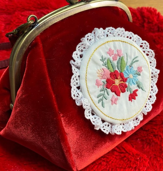 赤いベルベットの生地に、刺繍したお花にフリルをつけて可愛くしてみました。