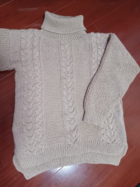 前身ごろは模様編みで、あとはイギリス片面引き上げ編みです。もう少し畦がキレイに出て欲しかったのですが、ちょっと編み目が緩すぎたようです。でも柔らかくてフワフワになりました。