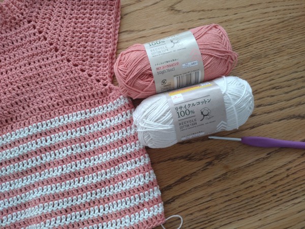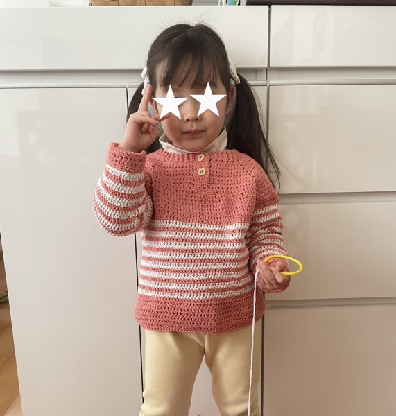 | 前回編んだコットンの春用カーデガンで念の為10玉用意してたんだけど、6玉で出来上がったので残りの4玉と同じ糸の白を2玉買い足して セーターを編みました。 残った糸はわずか…今年の目標はできるだけ残さず編み切る事なので、ギリギリまで使って編みました! 色を変えながらボーダーにして、首元はヘンリーネックにしてみました。 更に残った糸で リボンのヘアゴムも作りましたよ。 |