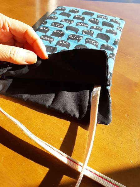 仕事中に使うポシェットを作りました。型くずれしないように接着芯を貼りました。紐は帯締を利用しました。