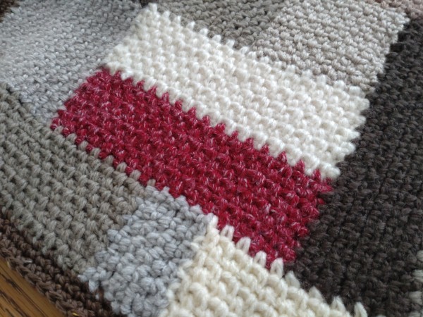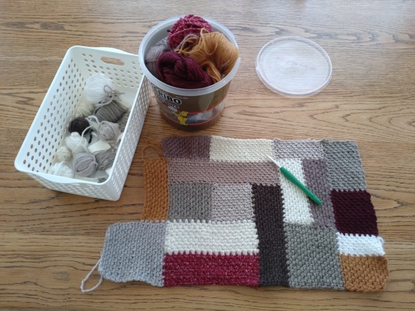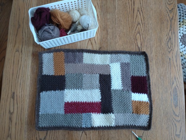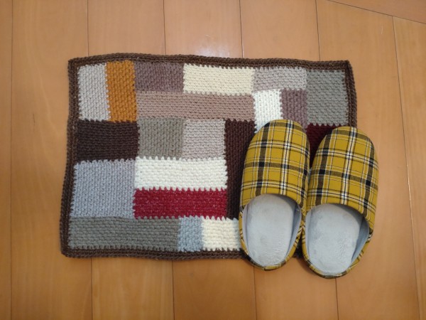 | 余り糸消費で大き目のマットを編みました。 グラニーバッグにしようかと思ったけど、割とぶ厚めなので、きれいにギャザーが寄らなくて、そのままマットとして使います(^_^;) プリーターカバーにぴったりな大きさ、玄関マットにするには少し小さめかなぁ。 どんな短い糸でも取りあえず置いてるので、まずは茶系をメインに集めて、そこから配色を見ながら 少し色合いが暗かったのでからし色や赤もアクセントに入れてみたりして、ひたすら繋げて繋げて… 同じ大きさのモチーフを編んでつなげようと思ったけど、残り糸を最大限に使い切るように 糸の長さに合わせて色んな大きさの四角を最後にとじはぎしなくても良いように編みながら繋げています。 縁取りの糸だけ一玉買いました。 楽しかった〜また別の色バージョンでもしたいくらいです。 |