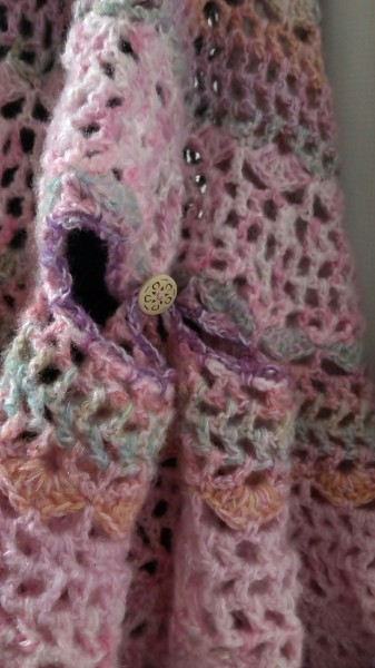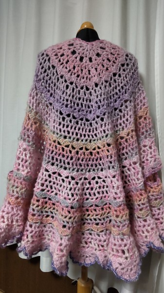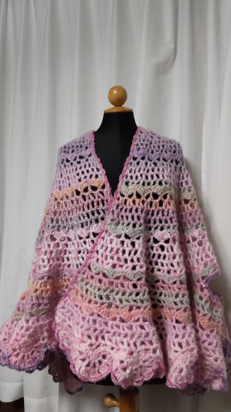 | すてきにハンドメイド1月号の、円形ストールを、他の方の作品を見て作りたくなり、ネットで本を購入しました。 家にあった閉店セールのモヘアと引き揃えでミストヤーンと、マフラーを編んだ残りのウィスターミックスロールガーデンを使用します。 足りなくなったときのために、ダイソーのファジーを用意しました。 腰までくるたっぷりの長さと、モヘアで暖かいショールが出来ました。 |