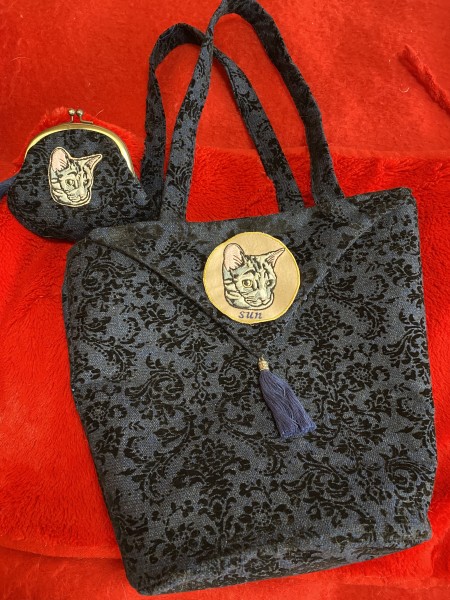 画像をいただいた猫さんを刺繍にし、トートバックとがま口に仕上げてみました。同じ色のフリンジをつけて品よく。