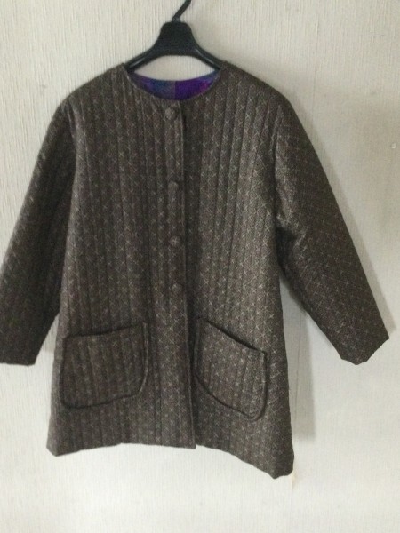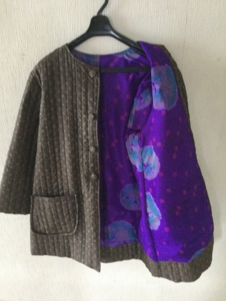 大島紬の生地にキルト芯を入れミシンでキルティングして、裏地には銘仙を使った