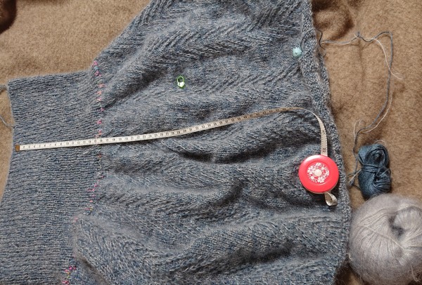裾模様を少なくするほうが目の錯覚で縦方向にスッキリするかもしれないと考え、裾を3cm短く、ヘリンボーン部分を1cm減で進めること(予定)にしました。