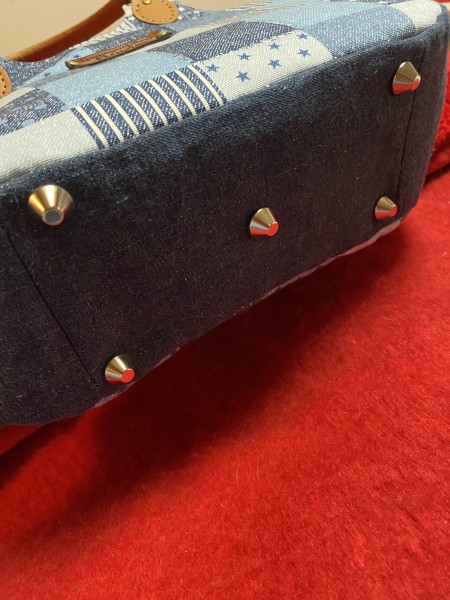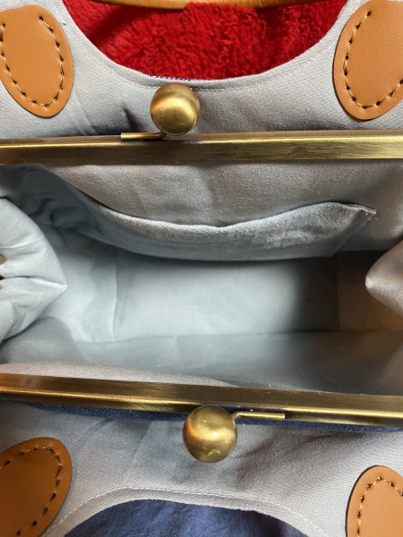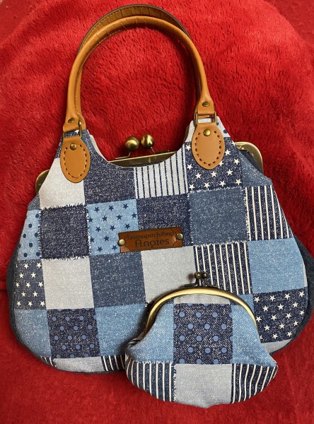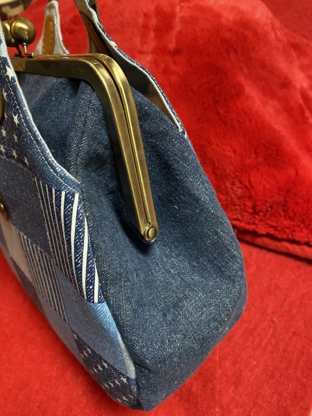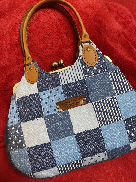ブルーのパッチワーク柄でカジュアルなあおりがま口バックを作りました。がま口もお揃いです。