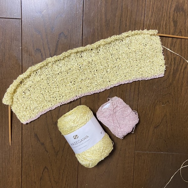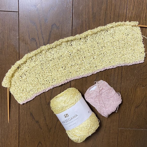 シルクハセガワさんのはっしーSBに入っていたクレアのベビーピンクを2段だけに使って3段目からは福袋に入っていたウグイスで編み始めました。
