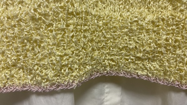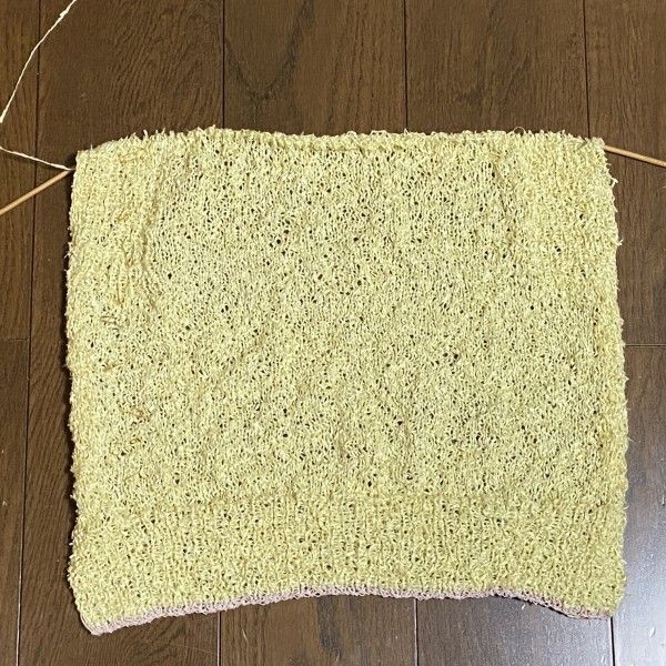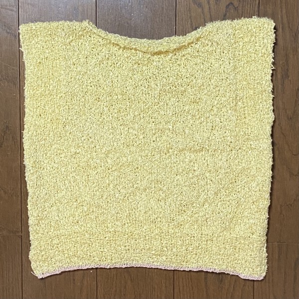 身頃が完成しました。縦ゲージが合わなくて段数を増やしましたが、もっと増やしてもよかったかなと思います。着た時に糸の重みで少し丈が長くなりそうな気はしますが、、、