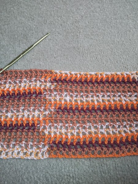 伸びにくい編み地で、なるべく軽く仕上げたいので長編みで方眼にしております。