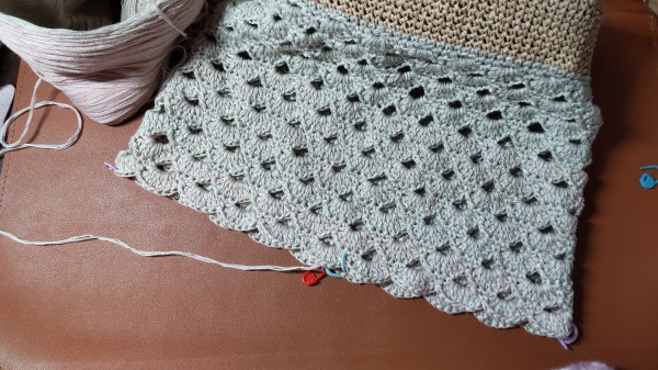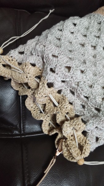 色を邪魔しないようにと、補強のためにラメ入りレースヤーンと引き揃えで、松編みをしていきます。