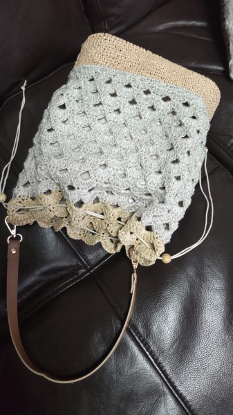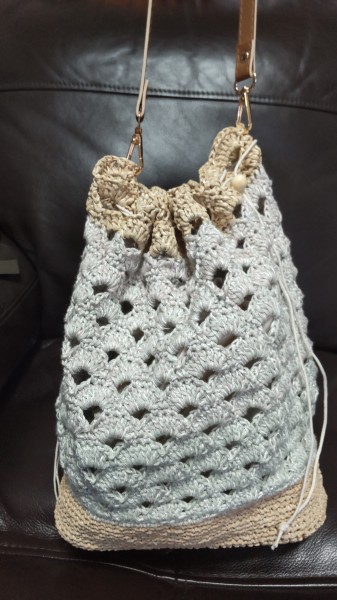 | ショールの残りのワンダーコットンでバッグを編もうと思います。 模様は「ビヨンドザリーフと編むバッグ」のPINというバッグの模様を参考にしました。 入れ口をしっかりさせたかったので、エコアンダリヤで編み足し、ワックスコードを通して巾着タイプにしました。 持ち手はセリアの バッグハンドルを使用しました。 |