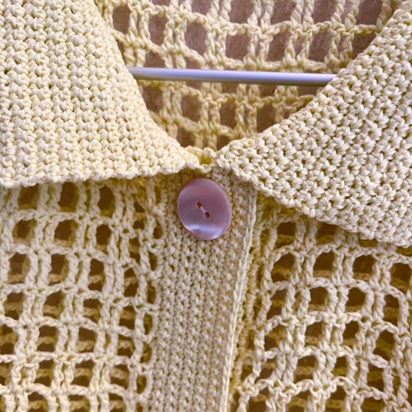 キーティキーティキーティのモトコさんのYouTubeを見ながら作りました。方眼編みの襟付きカーディガンです。長々編みがベースで難しい所もなくオシャレなものが編めました。夏になったらTシャツに羽織って着たいと思います。