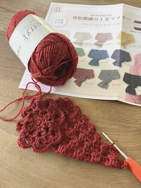 | ハマナカさんのレシピ、アメリーエフ1玉で編めるミニマフラー。母にプレゼントする予定です。 | |