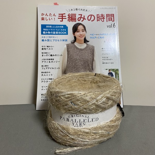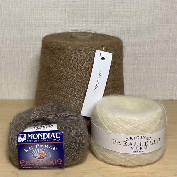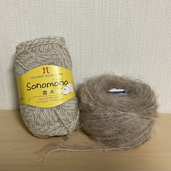家にある在庫糸で引き揃え糸(ブラウン2本、グレー1本、ホワイト1本)を作って、更にハマナカのソノモノ合太と引き揃えて袖を編むことにしました。