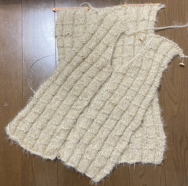 身頃が編めました。ほぼ250g2玉使いきりです。袖は違う糸を引き揃えることから始めようと思います。