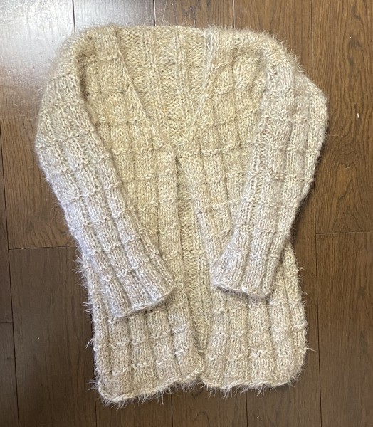 | 極太の糸(ルリコヤーンの引き揃え糸)や在庫糸でカーディガンを編みました。フワフワでとっても温かいです。 | |