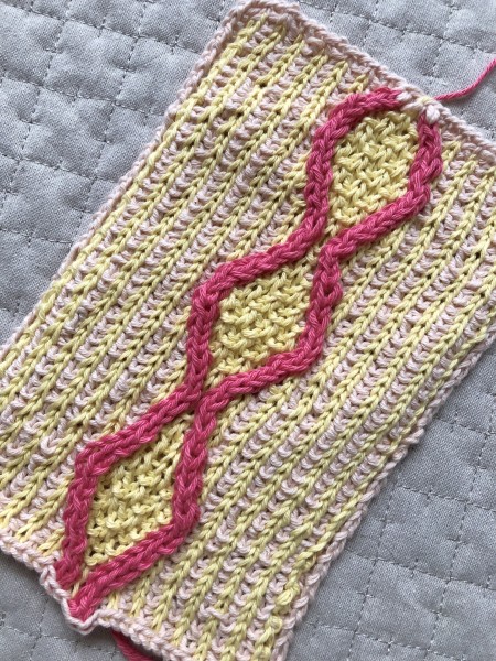色糸の交差に最初は戸惑ったけれど、一段37目の手軽さに助けられて進んでいます(^^)