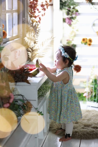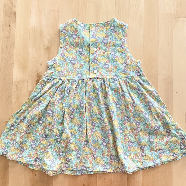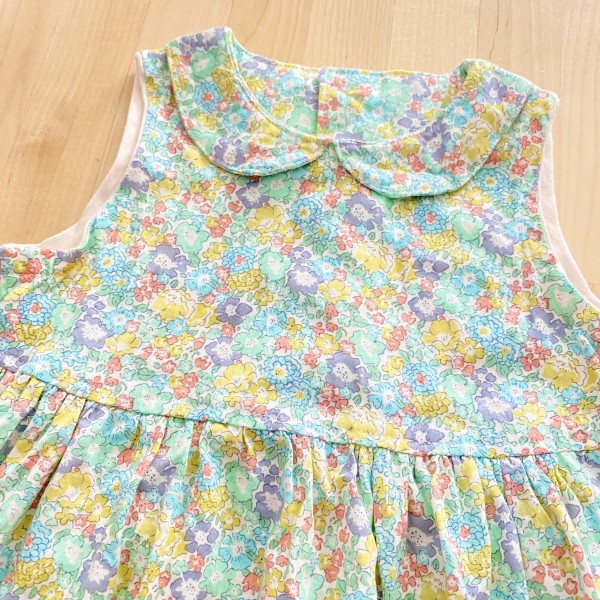 リバティの襟付きワンピース。袖はガーゼのバイアステープをつかって見えても可愛く見えるようにしました。