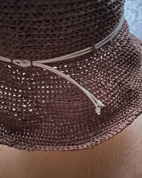 ちょっと自分の頭が大きいのとゆったりめにかぶりたかったのでレシピより少し大きめに編みました。日除けに良さげ。たたんでカバンに入れられます。