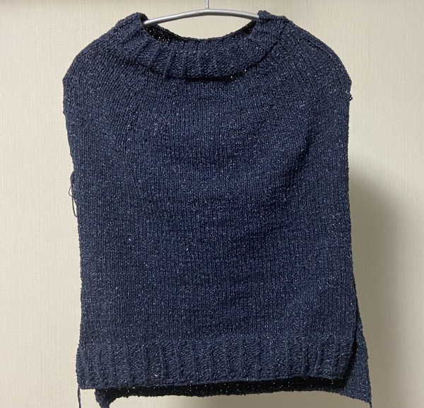 前後身頃と襟が編めました。