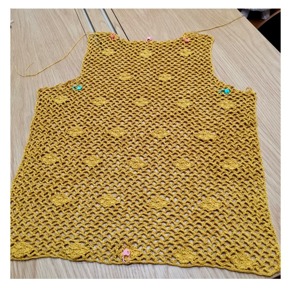 | 涼しく着用できるサマーベストをネット編みと松編み模様で編みました。 編み物教室の講師のお仕事の際に着用するため、裾にはソロバンビーズを編みつけてお洒落な感じに仕上げました。 |