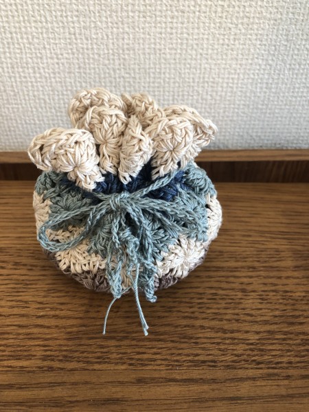 レース糸2本取りで編んだハーレクインステッチにミニ巾着。