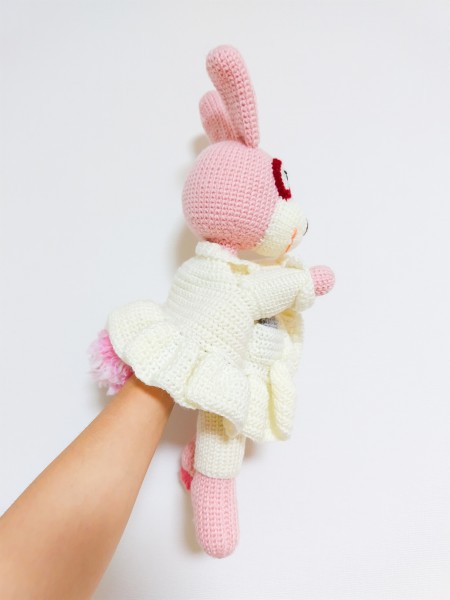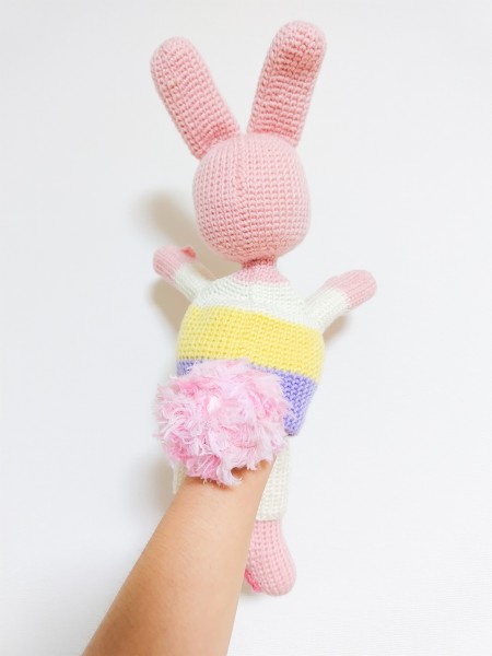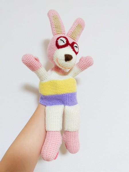 | メリヤス細編みで作った、うさぎのお医者さんのハンドパペットです。裾のフリルが特徴的な白衣は着脱可能で、ポケットには小さなピッチも入っています。主にハマナカ・わんぱくデニスのソフトなカラーを用いて優しい色合いのうさぎさんに仕上げました。メガネとにっこり笑顔、足の裏のハート模様とふさふさのしっぽが特徴的なキャラクターです。編み図はなく、編んだりほどいたりしながら試行錯誤して作りました。 | |