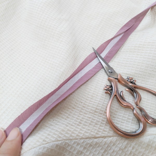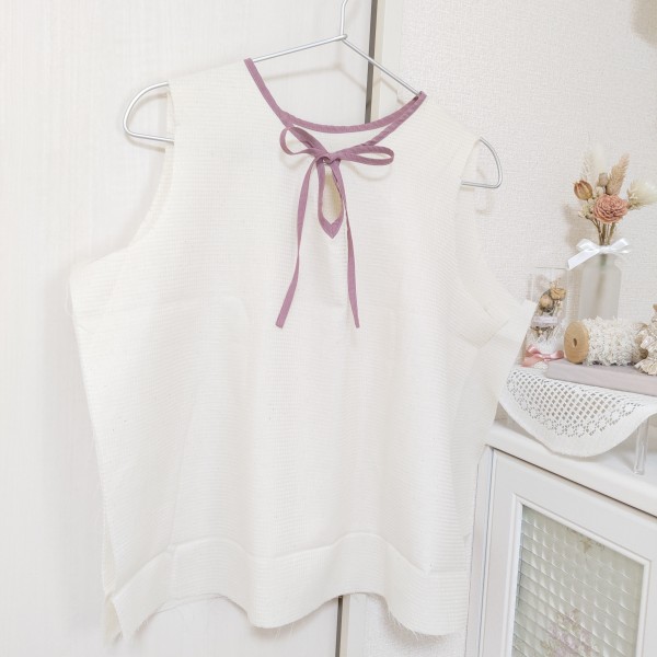 リボンを結ぶところだけ伸び止めテープを貼ってみて、なんとか落ちつきました!