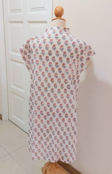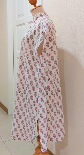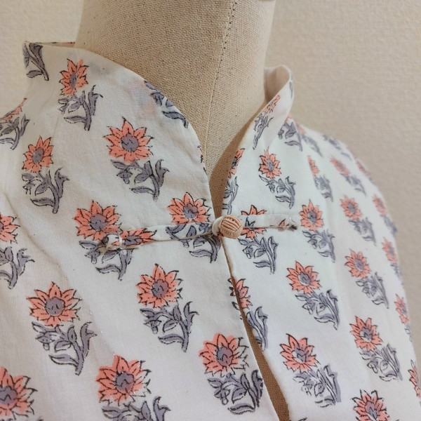 2着目ですが今回は襟の中華ボタンは市販のものを使いました。ワイドパンツと合わせて着ています。