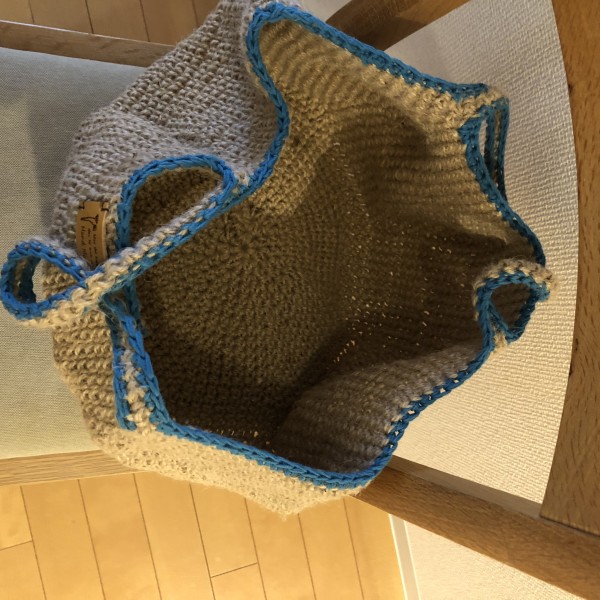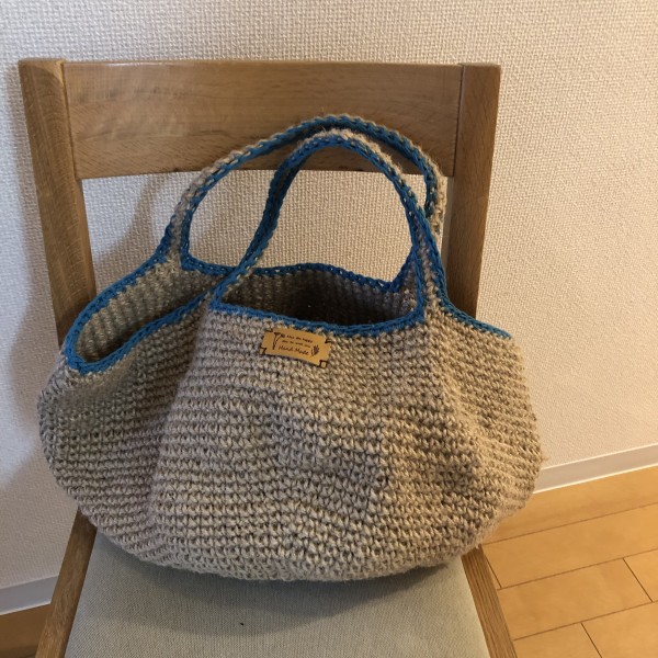 コクヨの麻紐を使い、円底のコロンとした形の肩掛けマルシェバッグ。仕上げにタグを付けてみました。容量はかなり大きめです。