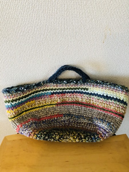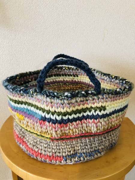 冬糸の余り毛糸を大量消費でカラフルなバスケットをメリヤス細編みで編みました。色々収納できそうです。