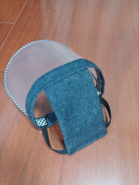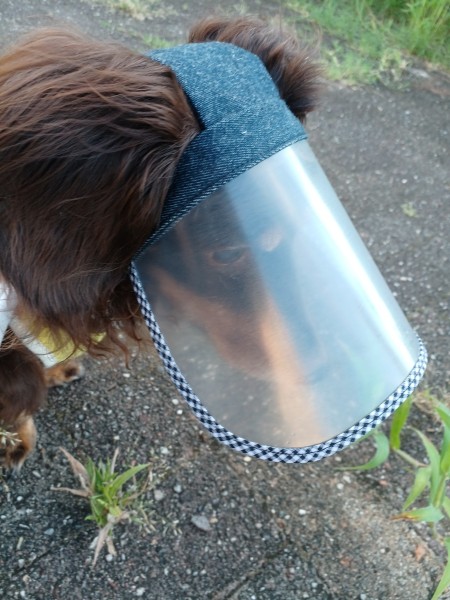 | 愛犬用のサンバイザーを作りました。WanQolというHPを参考にしています。 愛犬は病気で失明しているので、日除けというより障害物を防ぐために作ったので、つばが大きめです。つばはクリアファイルを使いました。 耳を出して固定しているので、走っても脱げませんでした。 ただ、つばが大きすぎましたね。鼻より長い(笑) |