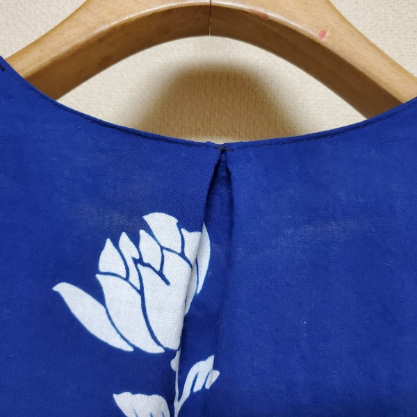 縫い物が初心者なので、生地幅の狭い浴衣生地の柄をキレイに生かすにはどうしたら、悩みました。襟ぐりが少し大きかったので、後ろでタックを取りました。