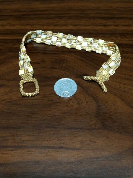 | タイルみたいで2つ穴が空いているビーズと特小ビーズをメインに使っています。 特小ビーズや留具に使った金色のビーズは汗等に強い加工がされています。 留具もビーズを編んで制作しました。 |