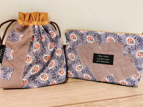 花柄のカットクロスを使って、家にあるハギレも取り入れてポーチと巾着の2点できました。