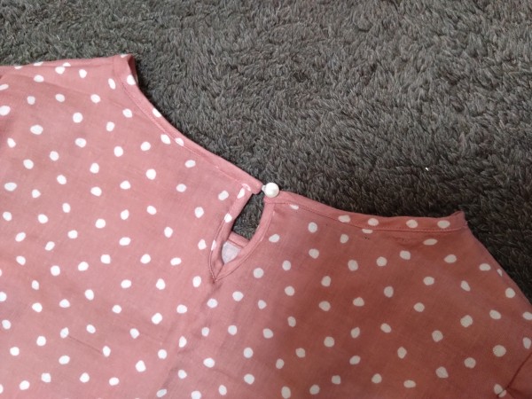 本(茅木真知子ホームクチュールセレクション 23冊のソーイングブックから)の通り、襟ぐりを共布にしてパイピングしました。