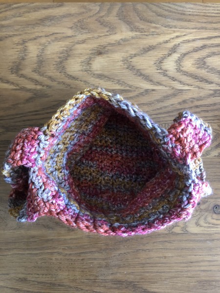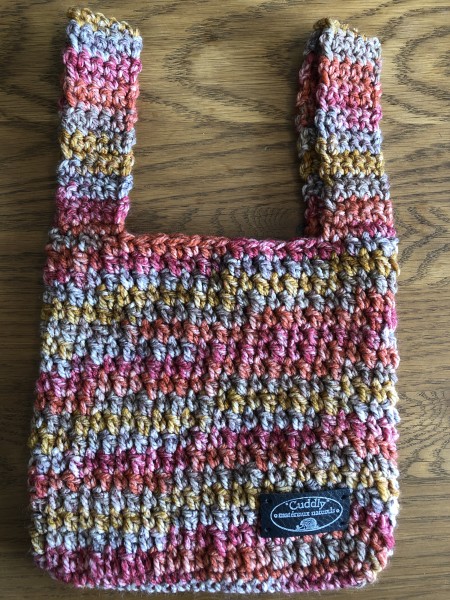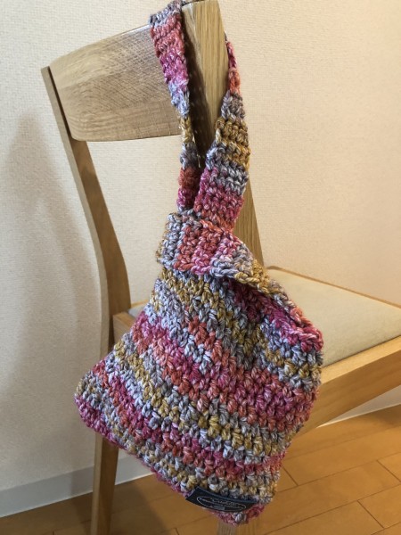 段染め毛糸2玉で編みきれるサイズでレジ袋型バッグを作りました。赤や茶系のボーダー柄と、ざっくりした編み地が秋っぽい感じです。