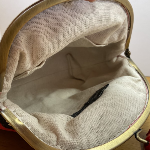 ネコ柄がま口ミニショルダー。接着芯だけだと口金に対してスカスカで嵌めるとき大変でした。