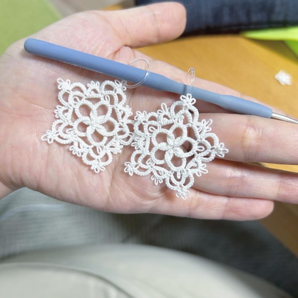 | 雪の結晶みたいで綺麗なピアスになりました。ビーズ入れたい気持ちもあるのでまた作るかもしれないです。 Le Blog de Frivole さんのフリーパターン『Rose & Crown』を結ってみました。 真ん中部分もシャトルで結いたかったので私立杜守図書館というサイトさんのやり方を参考にさせていただきました。 |