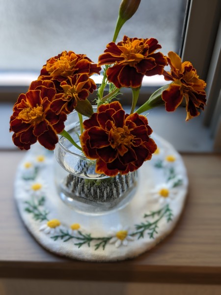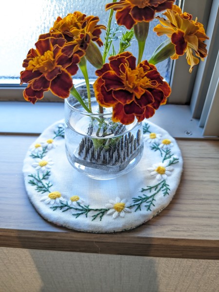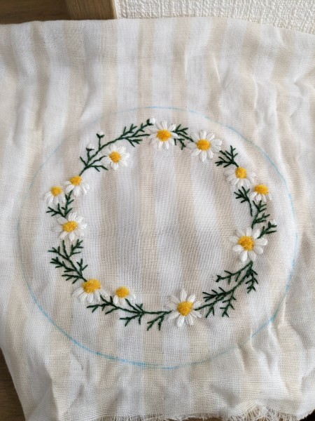 適当に描いたカモミールを刺繍しました。黄色い部分は立体感が出るようにモール毛糸で刺繍