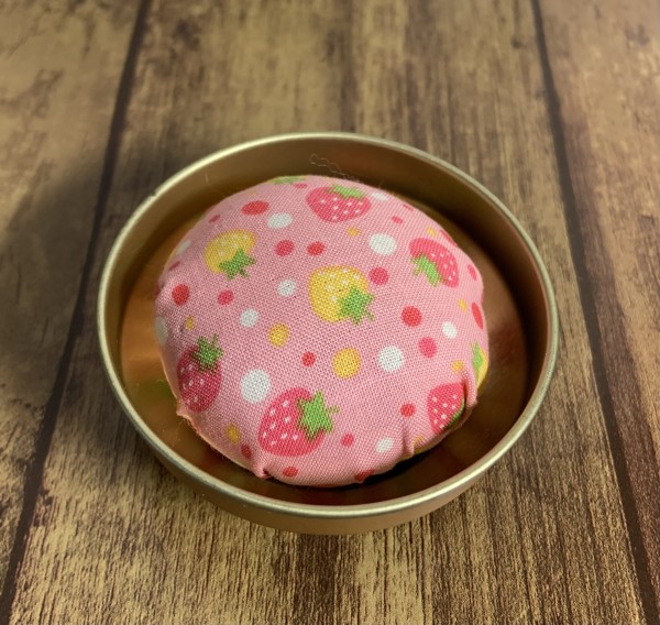 セリアで買った缶のフタにピンクッションを付けて使っています。