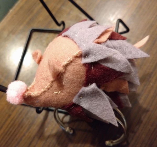 ハリネズミのアームピンクッションです。腕につけられる針山です。