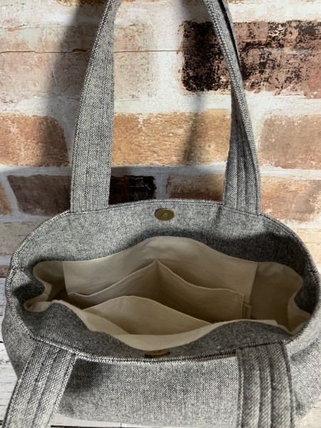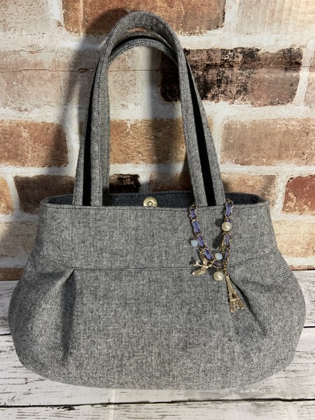 | 「バッグとポーチのお教室」の本の型紙で作りました。 本では刺繍をされていてとても素敵だったのですが、すぐ作りたかったので省略してしまいました。 寂しいので市販のバッグチャームつけました。 接着芯やキルト芯を貼ったりと部品が多いので私には大変でした。 気に入った持ち手が見つからず、同じ生地で作ったのでアクセントにベルベットリボンを縫い付けました。この持ち手結構気に入ってます。 |