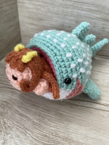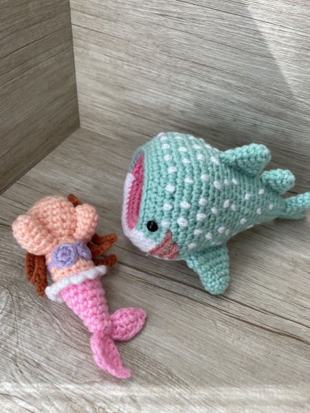 ジンベイザメと人魚を編みました。人魚は、ジンベイザメの口の中に入れます。