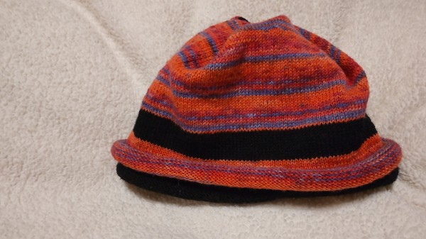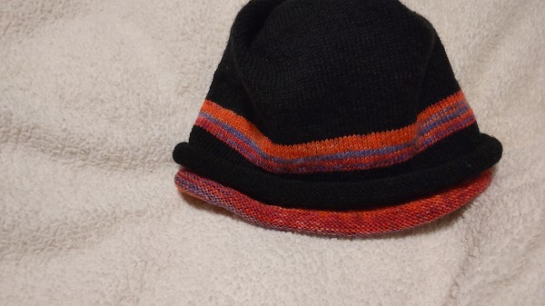 | Opal毛糸で夫の腹巻き帽子作ります。 魔法の毛糸フェアで見た作品を参考に、鮮やかなオレンジ系と黒のツートンカラーです。 ちょっと遅れたクリスマスプレゼントになりましたが、とても喜んでくれました。 |