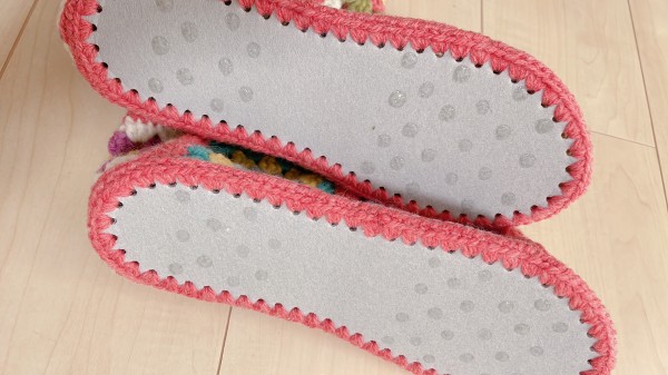 アドバイスに従ってアイロンかけました!また、足先などもう少し余裕が出るように、一つ一つのモチーフを大きくしました。ルームシューズ底に滑り止めを塗って、しめしめもうすぐ完成…と思っていたら、モチーフを左右逆に繋げるのを忘れてたことに気づいてしまった!これだと左側や右側から見た時に側面が左右とも同じ配色のモチーフになってしまいます(ToT)